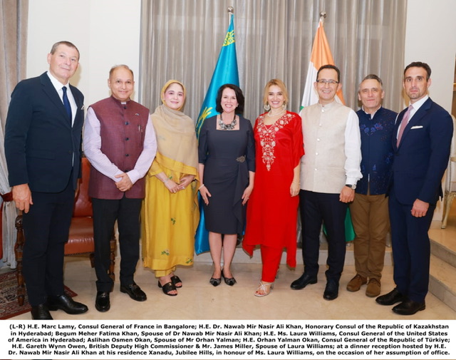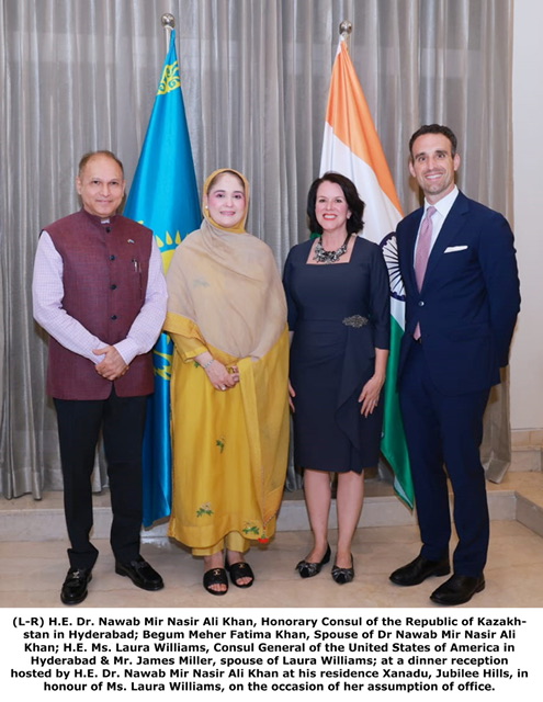 Hyderabad, September 2025: In a distinguished gesture underscoring friendship, cultural harmony, and diplomatic goodwill, H.E. Dr. Nawab Mir Nasir Ali Khan, Honorary Consul of the Republic of Kazakhstan in Hyderabad for Telangana and Andhra Pradesh, hosted an elegant dinner reception at his residence Xanadu, Jubilee Hills, in honour of Ms. Laura Williams, Consul General of the United States of America in Hyderabad, on the occasion of her assumption of office.