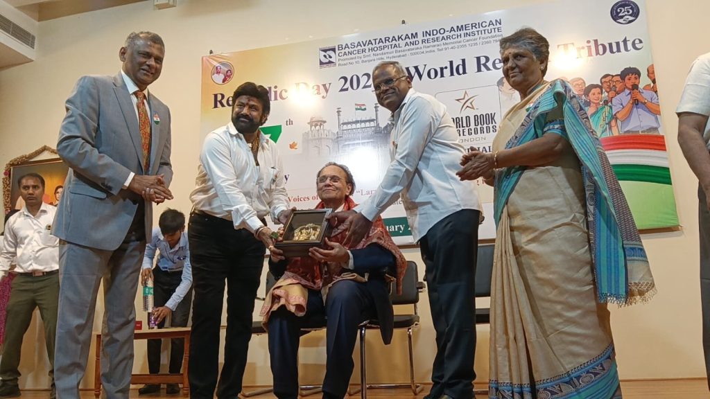 The cancer patients who had their larynx removed while undergoing treatment at the Head & Neck Department of Basavatarakam Indo American Cancer Hospital and Research Institute impressed everyone by singing the national anthem with an artificial larynx implanted in their bodies. At the subsequent event held at hospital auditorium, representatives from the World Book of Records London presented the world record certificate to Shri Nandamuri Balakrishna, Chairman, BIACH&RI. On this occasion, everyone appreciated the patients and doctors.